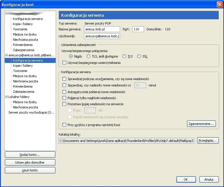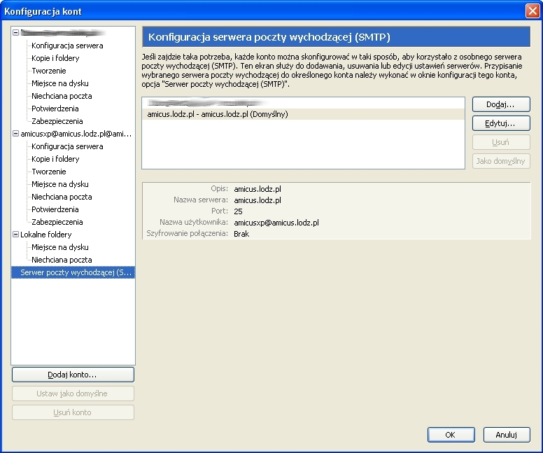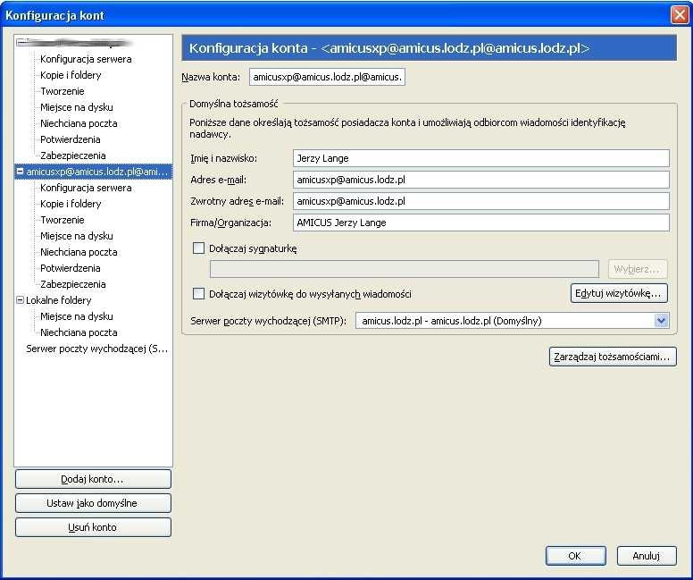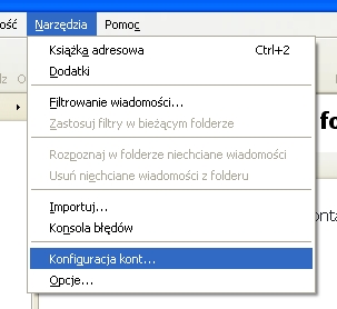 Poniżej opisano wzór konfiguracji konta poczty elektronicznej dla serwera obsługującego domenę amicus.lodz.pl po zmianach wprowadzonych od dnia 2008.05.24. Aby ustawić konfigurację konta pocztowego uruchamiamy program Mozilla Thuderbird. Następnie wybieramy funkcję Narzędzia | Konfiguracja kont ....