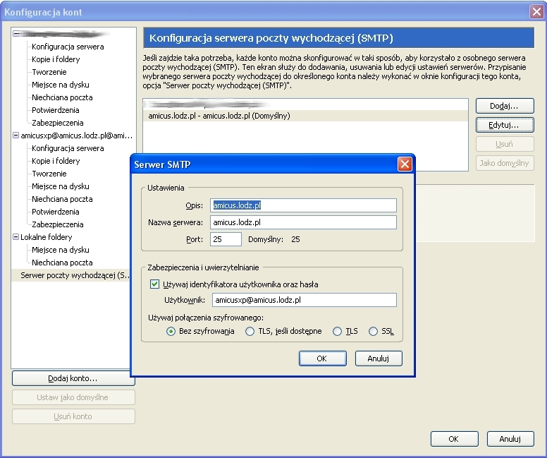 W oknie ustawień serwera SMTP wpisujemy informacje zgodnie z widocznymi w okienku obok z wyjątkiem nazwy użytkownika. Nazwa użytkownika przed znakiem "@" będzie w Państwa konfiguracji inna. Zaznaczamy opcję braku połączenia szyfrowanego i zamykamy okno przyciskiem OK.