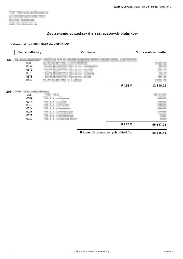Raport bardzo podobny do raportu 1.33. Różnica między raportami polega na sumowaniu obrotu z odbiorcą. W raporcie 1.33.x widzimy poszczególne dokumenty handlowe dla danego odbiorcy w ramach grupowania płatnika. W raporcie 1.48.x widzimy tylko sumę obrotów, bez podziału na poszczególne dokumenty handlowe.