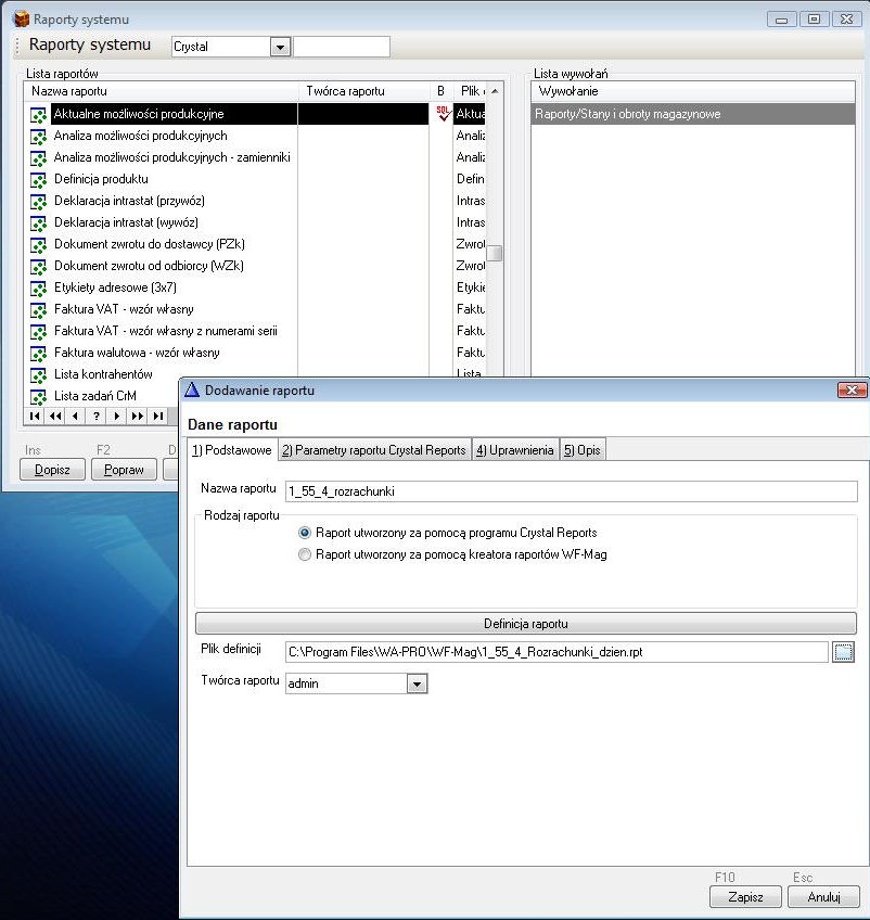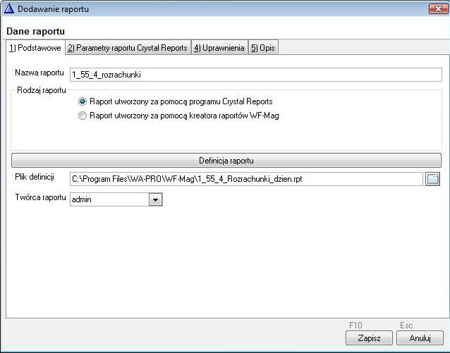 Poleceniem "dopisz" w lewym dolnym rogu formatki tworzymy nowy raport. W zakładce "podstawowe" zaznaczamy , że jest to raport z programu Crystal Reports. W polu nazwa wprowadzamy nazwę raportu jaka będzie widniała później w menu "wydruki" naszego programu. Dla lepszej orientacji w przypadku dużej ilości raportów umieszczamy numer raportu i nazwę skróconą tak, jak to widać na obrazku obok. Do pola "plik definicji" wprowadzamy nazwę pliku raportu umieszczonego w głównym folderze programu. Jeśli plik jest wykorzystywany w środowisku sieci lokalnej i na różnych stanowiskach instalacje mogą być umieszczone w różnych lokalizacjach usuwamy z wpisu dokładną lokalizację pliku pozostawiając tylko jego nazwę. W przypadku widocznym na obrazku zamiast "C:\WF-Mag\ 7_40_4\ 1_55_4_Rozrachunki_dzien.rpt" pozostanie tylko wpis "1_55_4_Rozrachunki_dzien.rpt".