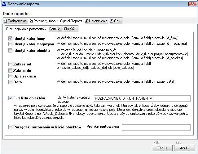 3.W kolejnej zakładce "Parametry raportu Crystal Reports" zaznaczamy opcję "identyfikator firmy" oraz "filtr listy obiektów". W tym ostatnim wpisujemy nazwę "ROZRACHUNEK.ID_KONTRAHENTA".
