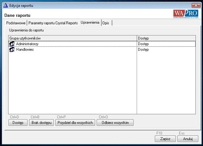 4.W kolejnej zakładce "uprawnienia" definiujemy grupy użytkowników systemu WF-Mag dla Windows, posiadających możliwość korzystania z raportu. Po wybraniu opcji "przydziel dla wszystkich" wszystkie grupy użytkowników otrzymają możliwość korzystania z instalowanego raportu. Po wprowadzeniu i sprawdzeniu danych zapisujemy formatkę i wracamy do listy raportów.