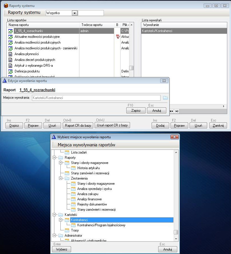 5.Zaznaczamy nasz raport w oknie po lewej stronie i uruchamiamy funkcję "dodaj". Funkcja ta pozwoli nam zdefiniować miejsce wywołania wydruku w programie. W opisywanym przypadku wybieramy w kolejnych oknach lokalizację "Kartoteki / Kontrahenci" i zapisujemy formatkę.