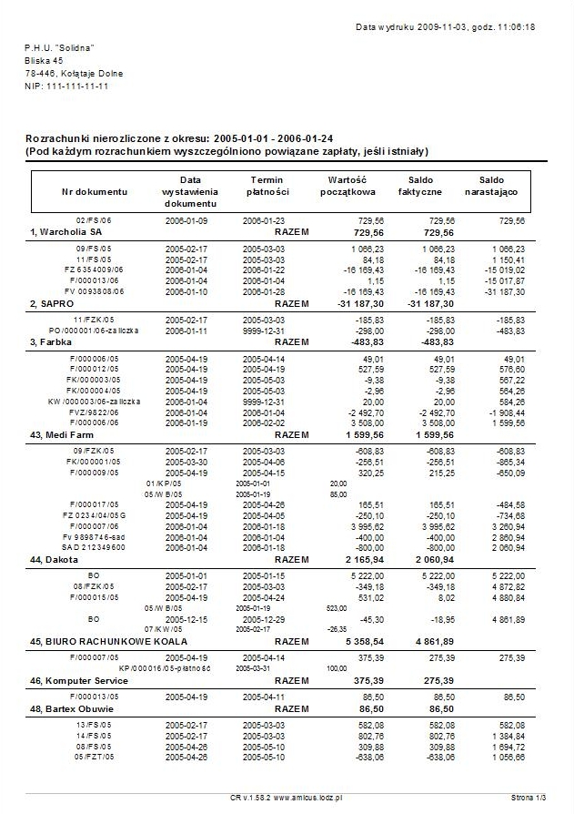 Raport grupuje rozrachunki według numeru FK kontrahenta narastająco, a następnie sortuje według daty dokumentów. Jako nazwa firmy jest pobierana zawartość pola "nazwa kontrahenta" z jego kartoteki. Dla lepszej identyfikacji umieściliśmy przed nazwą kontrahenta numer konta FK. Pozwala to odróżnić firmy o tej samej nazwie. Na końcu podsumowano kolumny wartości początkowej dokumentów i sald ich rozrachunku. Ta wersja raportu nie pozwala na wybór określonej grupy kontrahentów. Raport jest obliczany dla wszystkich kontrahentów w bazie.
