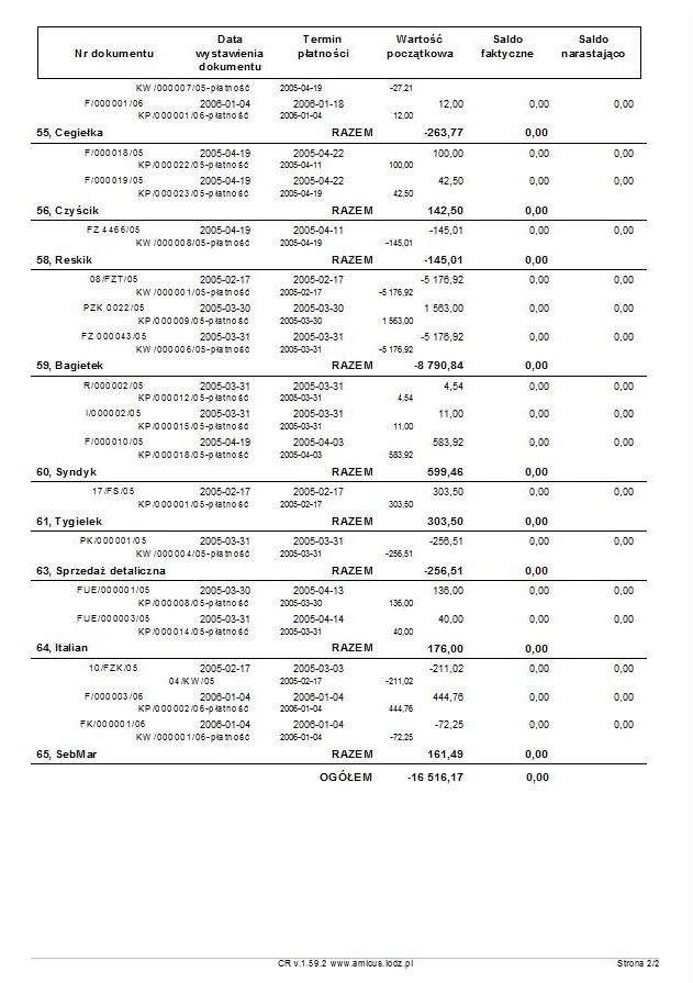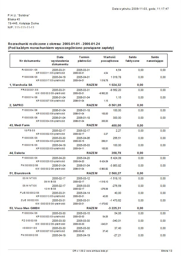 Raport grupuje rozrachunki według numeru FK kontrahenta narastająco, a następnie sortuje według daty dokumentów. Jako nazwa firmy jest pobierana zawartość pola "nazwa kontrahenta" z jego kartoteki. Dla lepszej identyfikacji umieściliśmy przed nazwą kontrahenta numer konta FK. Pozwala to odróżnić firmy o tej samej nazwie. Na końcu podsumowano kolumny wartości początkowej dokumentów i sald ich rozrachunku. Ta wersja raportu nie pozwala na wybór określonej grupy kontrahentów. Raport jest obliczany dla wszystkich kontrahentów w bazie.