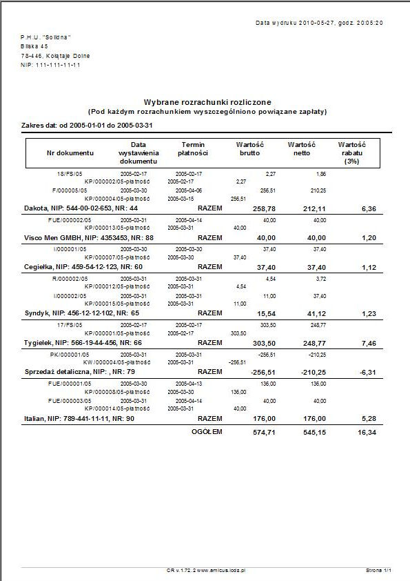 Raport 1.72 opracowany dla użytkowników programu WF-Mag dla Windows w wersjach prestiż i prestiż plus ma za zadanie obliczanie rabatu/premii dla kontrahentów za terminowe rozliczanie rozrachunków.