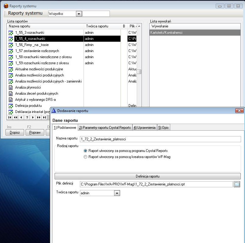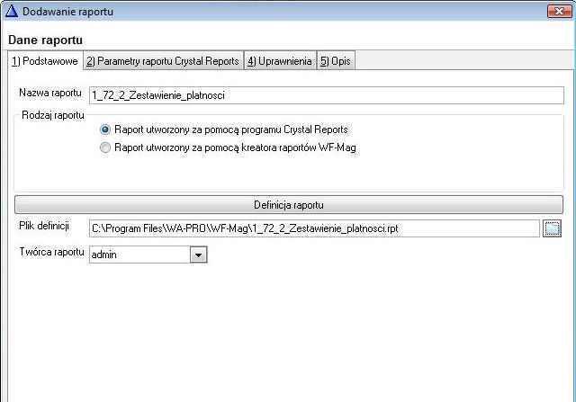 Poleceniem "dopisz" w lewym dolnym rogu formatki tworzymy nowy raport. W zakładce "podstawowe" zaznaczamy , że jest to raport z programu Crystal Reports. W polu nazwa wprowadzamy nazwę raportu jaka będzie widniała później w menu "wydruki" naszego programu. Dla lepszej orientacji w przypadku dużej ilości raportów umieszczamy numer raportu i nazwę skróconą tak, jak to widać na obrazku obok. Do pola "plik definicji" wprowadzamy nazwę pliku raportu umieszczonego w głównym folderze programu. Jeśli plik jest wykorzystywany w środowisku sieci lokalnej i na różnych stanowiskach instalacje mogą być umieszczone w różnych lokalizacjach usuwamy z wpisu dokładną lokalizację pliku pozostawiając tylko jego nazwę. W przypadku widocznym na obrazku zamiast "C:\Program Files\WA-PRO\WF-Mag\1_72_2_Zestawienie_platnosci.rpt" pozostanie tylko wpis "1_72_2_Zestawienie_platnosci.rpt".