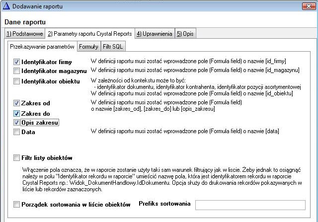 3.W kolejnej zakładce "Parametry raportu Crystal Reports" zaznaczamy opcje "identyfikator firmy", "Zakres od", "Zakres do" oraz "Opis zakresu".