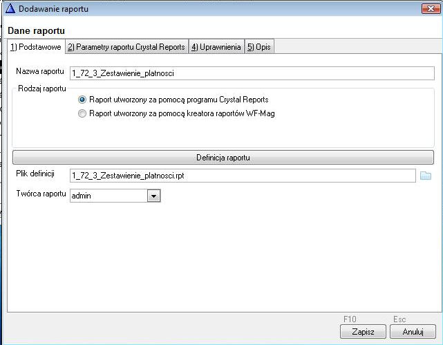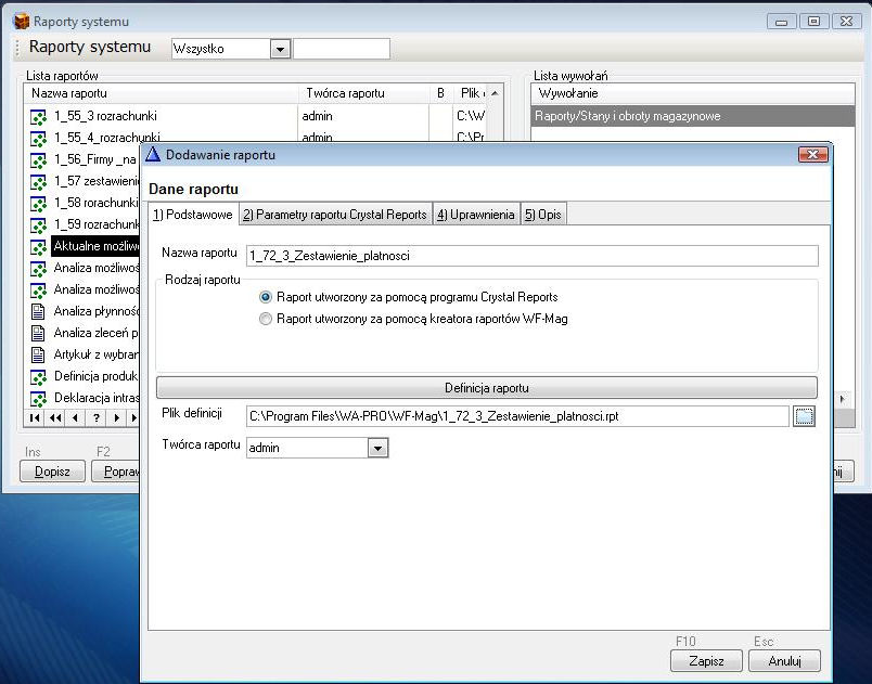 Poleceniem "dopisz" w lewym dolnym rogu formatki tworzymy nowy raport. W zakładce "podstawowe" zaznaczamy , że jest to raport z programu Crystal Reports. W polu nazwa wprowadzamy nazwę raportu jaka będzie widniała później w menu "wydruki" naszego programu. Dla lepszej orientacji w przypadku dużej ilości raportów umieszczamy numer raportu i nazwę skróconą tak, jak to widać na obrazku obok. Do pola "plik definicji" wskazujemy w strukturze plików nasz plik raportu umieszczony w głównym folderze programu. Jeśli plik jest wykorzystywany w środowisku sieci lokalnej i na różnych stanowiskach instalacje mogą być umieszczone w różnych lokalizacjach usuwamy z wpisu dokładną lokalizację pliku pozostawiając tylko jego nazwę. W przypadku widocznym na obrazku zamiast "C:\Program Files\WA-PRO\WF-Mag\1_72_3_Zestawienie_platnosci.rpt" pozostanie tylko wpis "1_72_3_Zestawienie_platnosci.rpt".