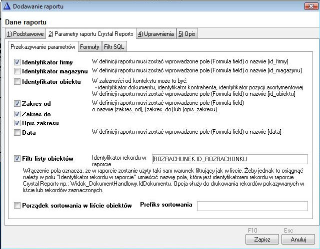 3.W kolejnej zakładce "Parametry raportu Crystal Reports" zaznaczamy opcje "identyfikator firmy", "Zakres od", "Zakres do", "Opis zakresu". Zaznaczamy też "Filtr listy obiektów" i w polu obok wpisujemy "ROZRACHUNEK.ID_ROZRACHUNKU".