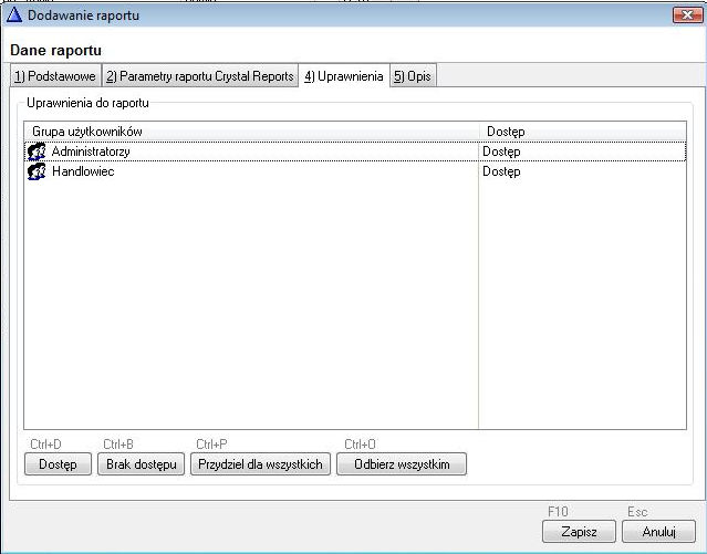 4.W kolejnej zakładce "uprawnienia" definiujemy grupy użytkowników systemu WF-Mag dla Windows, posiadających możliwość korzystania z raportu. Po wybraniu opcji "przydziel dla wszystkich" wszystkie grupy użytkowników otrzymają możliwość korzystania z instalowanego raportu. Po wprowadzeniu i sprawdzeniu danych zapisujemy formatkę i wracamy do listy raportów.
