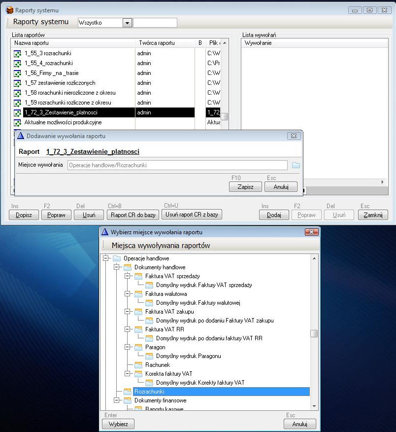 5.Zaznaczamy nasz raport w oknie po lewej stronie i uruchamiamy funkcję "dodaj". Funkcja ta pozwoli nam zdefiniować miejsce wywołania wydruku w programie. W opisywanym przypadku wybieramy w kolejnych oknach lokalizację " Operacje handlowe / Rozrachunki" i zapisujemy formatkę.