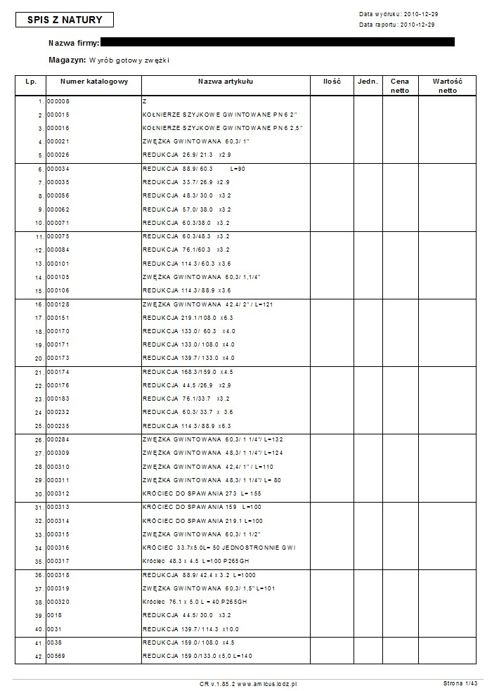 8. Raport drukuje artykuły z bazy, powiązane z dana firmą i aktualnie ustawionym magazynem,